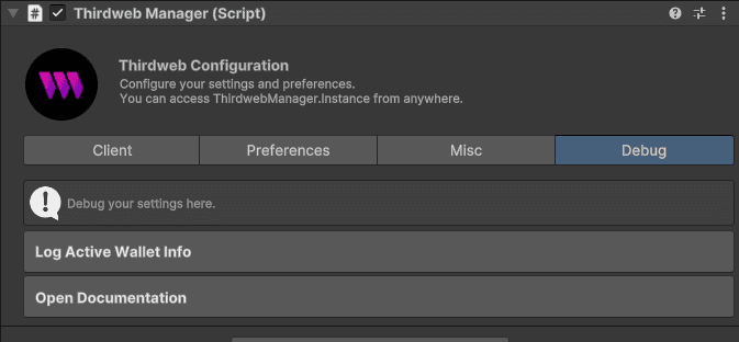 • Show Debug Logs: Mirrors ThirdwebDebug.IsEnabled, enabling verbose diagnostics during development.