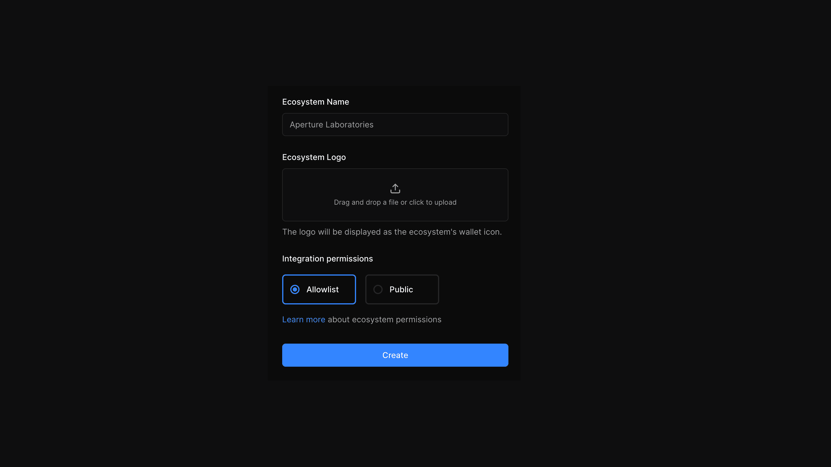 Visit the Ecosystem Wallets dashboard and enter the name of your ecosystem and choose your logo.