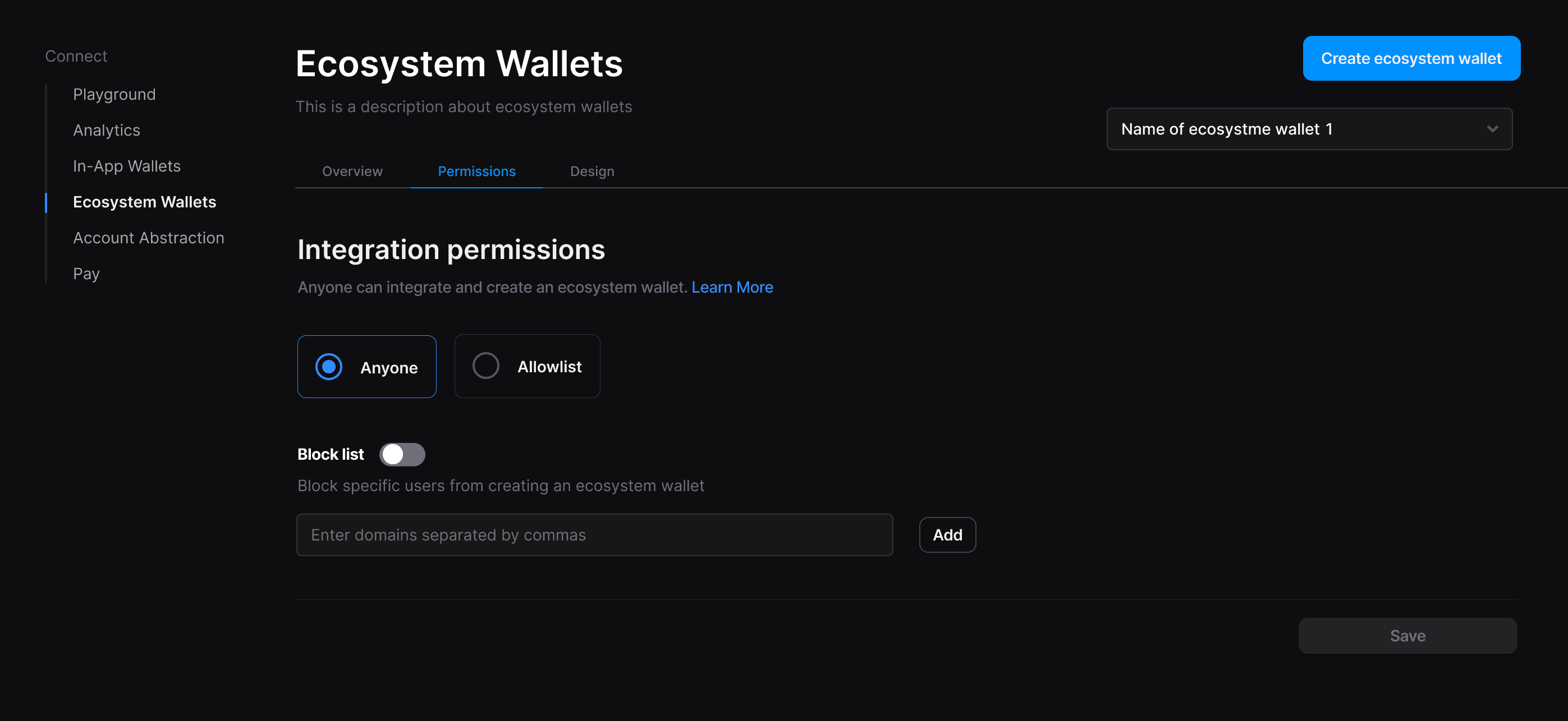 There are two permission options depending on whether you’d like an open or exclusive ecosystem wallet.